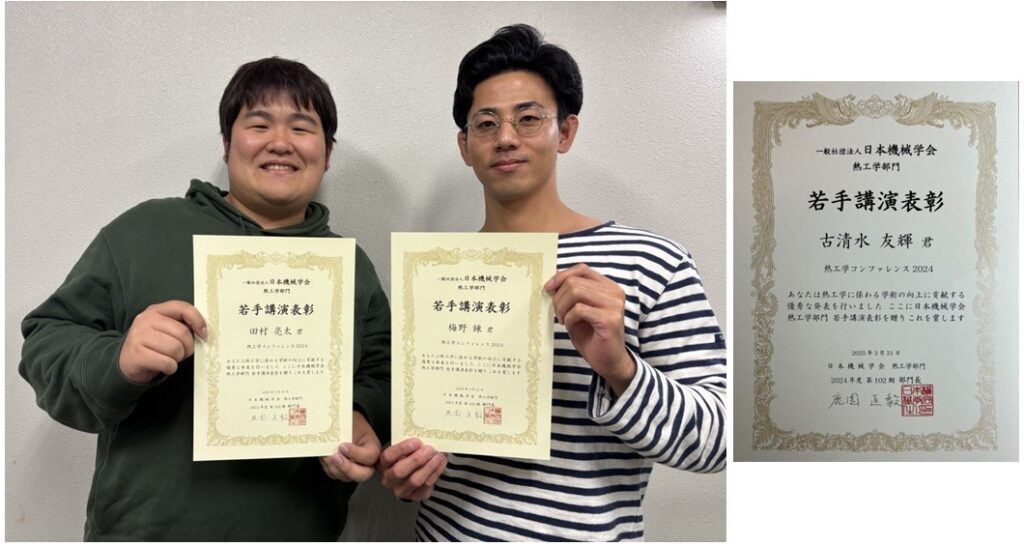 山口県のKDDI維新ホールで開催された熱工学コンファレンス2024(2024年10月5日(土)~6日(日))において博士後期課程3年の梅野錬さん、博士後期課程2年の田村亮太さん、2024年度卒業生古清水友輝さん(発表当時それぞれ博士後期課程2年、博士後期課程1年、博士前期課程2年)が研究発表を行い、「日本機械学会熱工学部門若手講演表彰」を受賞しました。